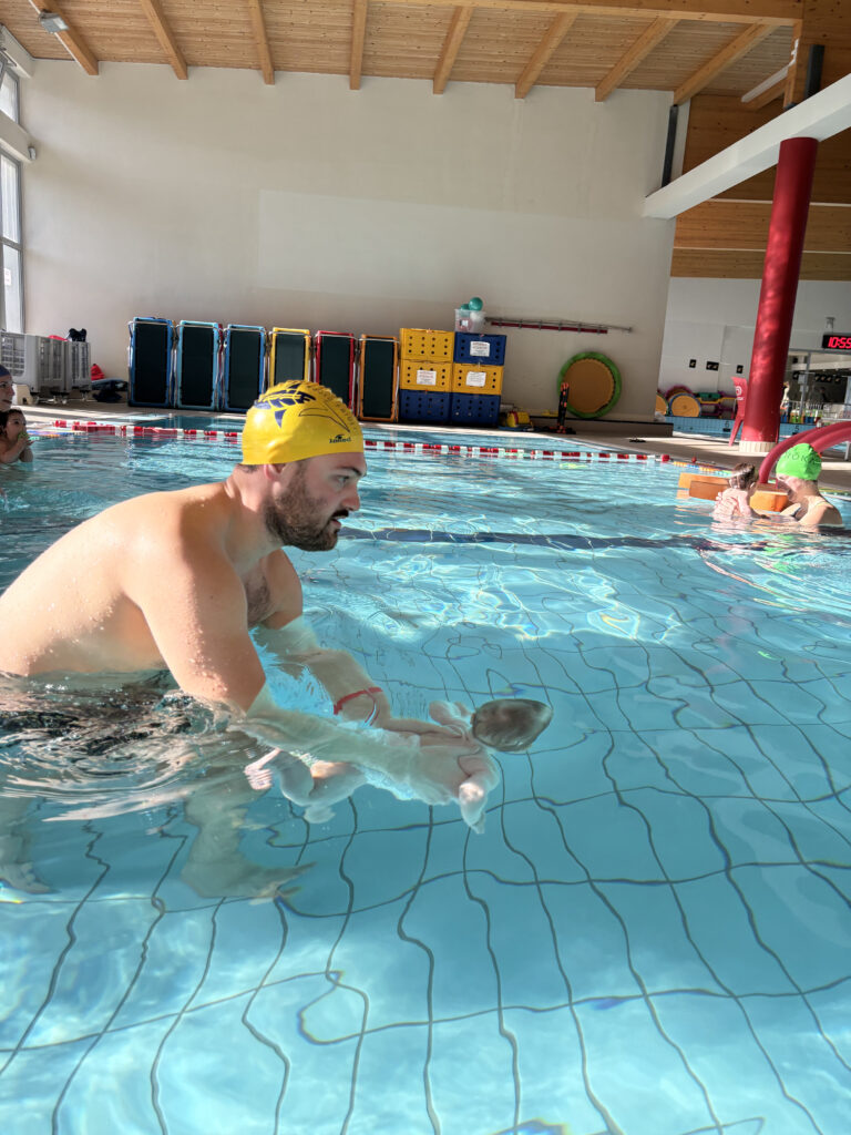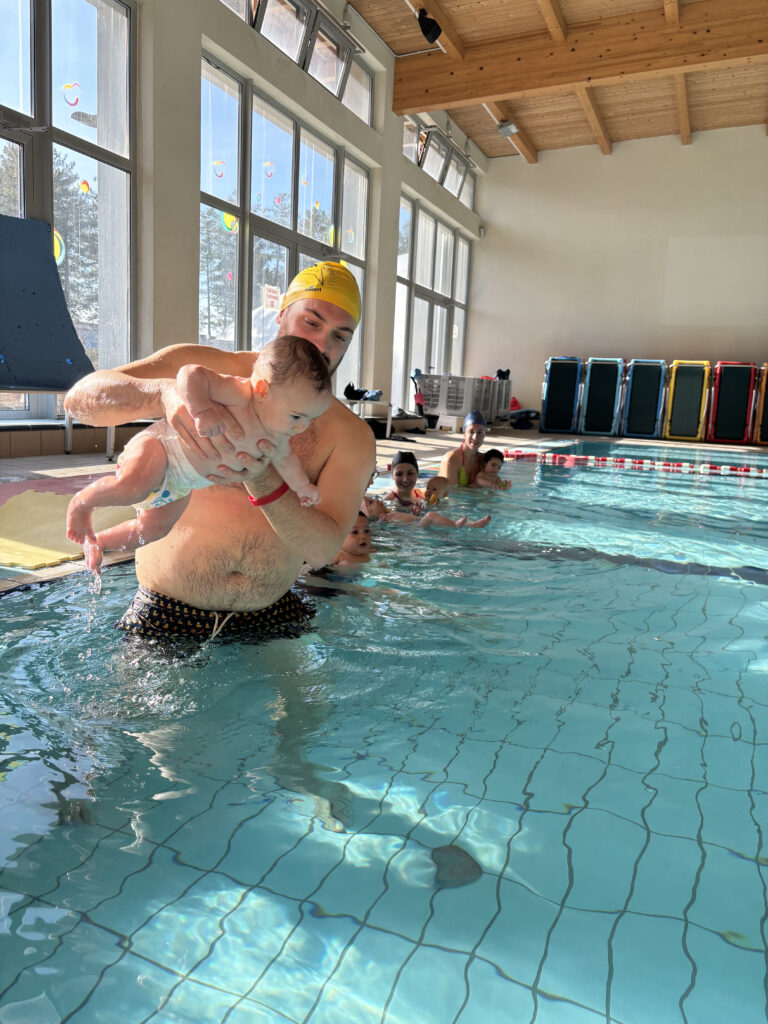 L’ingresso in vaschino è previsto per il bambino (indossando il pannolino acquatico) e la persona che lo accompagnerà (1 genitore). Sarebbe preferibile che alla prima lezione fosse garantita la presenza della mamma.